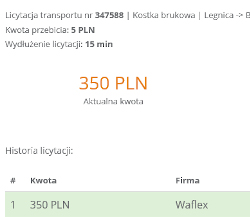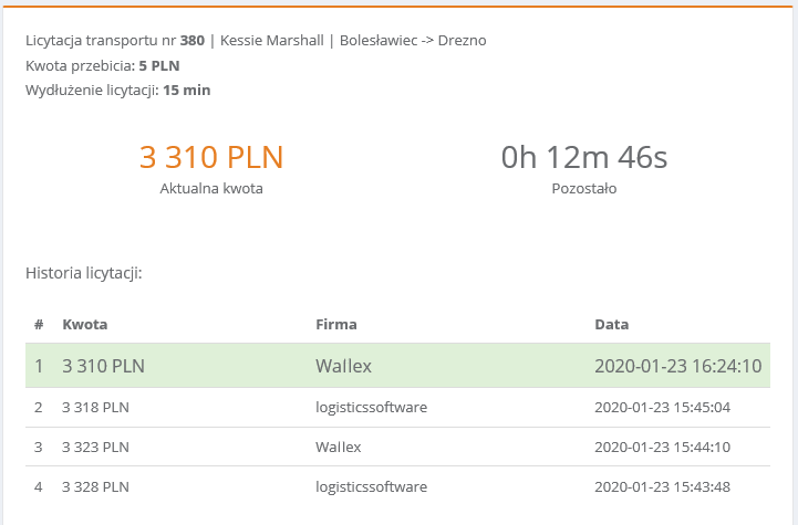Dodatkowo, jeżeli podczas licytacji firma transportowa popełni błąd (kwota za niska) to można odrzucić taką ofertę, a aktualna kwota licytacji zostanie automatycznie przywrócona do poprzedniej.