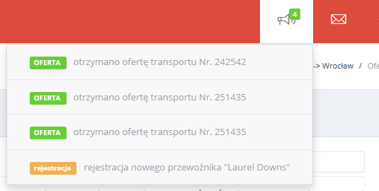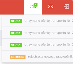 Podczas otrzymywania ofert, odpowiedzi na zapytania ofertowe, rejestracji nowego kontrahenta, wygranie zlecenia, itp. wysyłane są powiadomienia. Powiadomienia wyświetlają się na górze strony i odświeżają się automatycznie.
