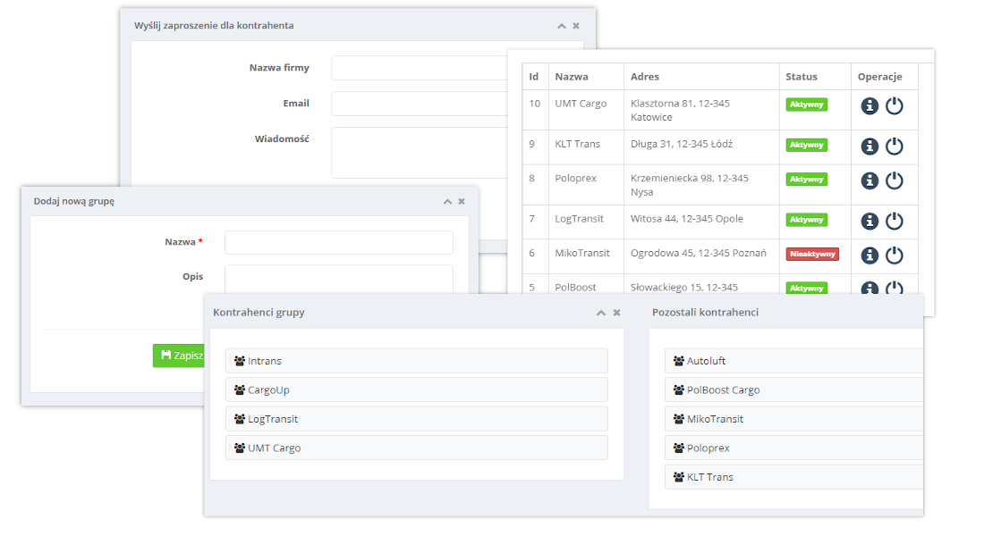System umożliwiają podzielenie kontrahentów na grupy, dzięki który można łatwo wysyłać zlecenia transportów i zapytania ofertowe konkretnym rodzajom firm.