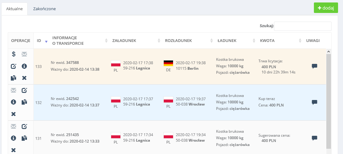 Przejrzysty widok zleceń. Podziała na aktualne i zakończone zlecenia. Zarządzenie transportami z poziomu jednej kolumny - Operacje.